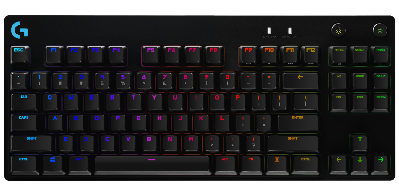 The G Pro looks like what would happen if we were to take a standard full mechanical keyboard and simply chop off the numpad with some kind of high-tech paper cutter. It has a full selection of keys (minus the numpad), in addition to a key that controls the lighting and one that activates a Game Mode. The Game Mode is useless for programmers. It prevents you from clicking keys such as Alt-Tab or the Windows button, so that you won’t accidentally shut down your game midway. I wish this key was programmable to something else - but alas, you can’t.